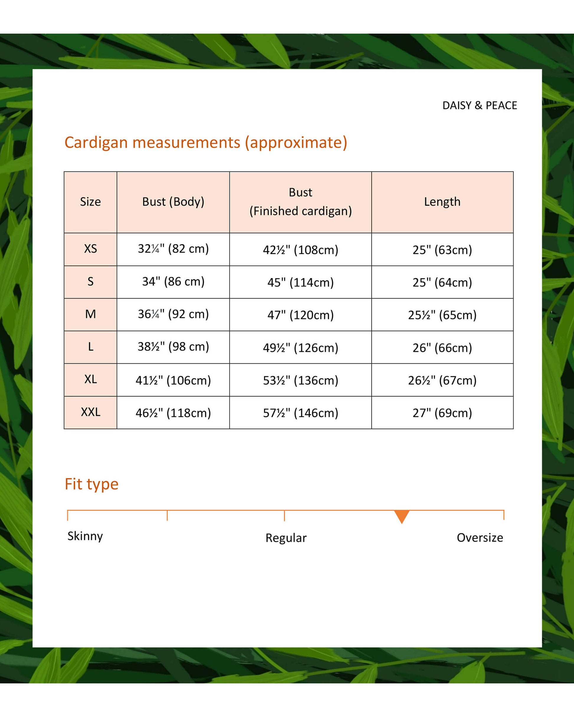 - The cardigan is made from 5 pieces (Back, 2 Front panels and 2 sleeves). Each piece is made bottom-up, separately then sewn together.
