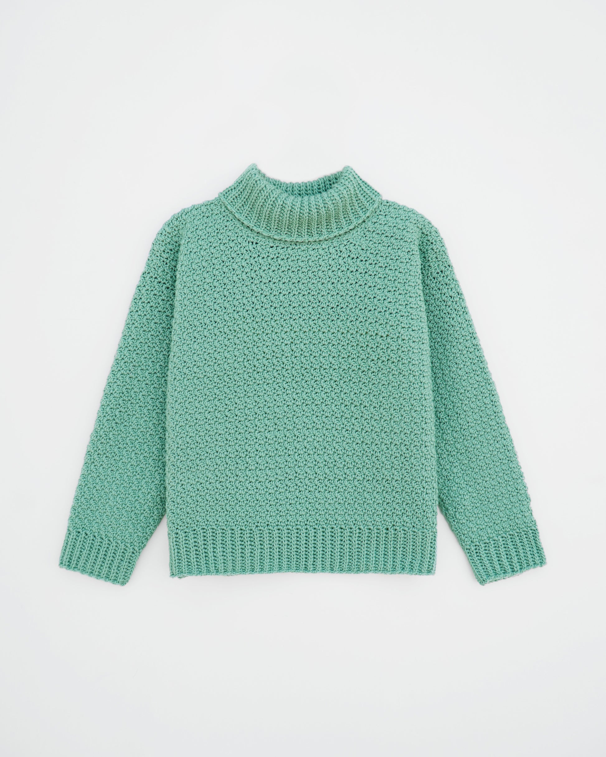 - The sweater is made from 4 pieces (Back, Front panels and 2 sleeves). Each piece is made bottom-up, separately then sewn together.
