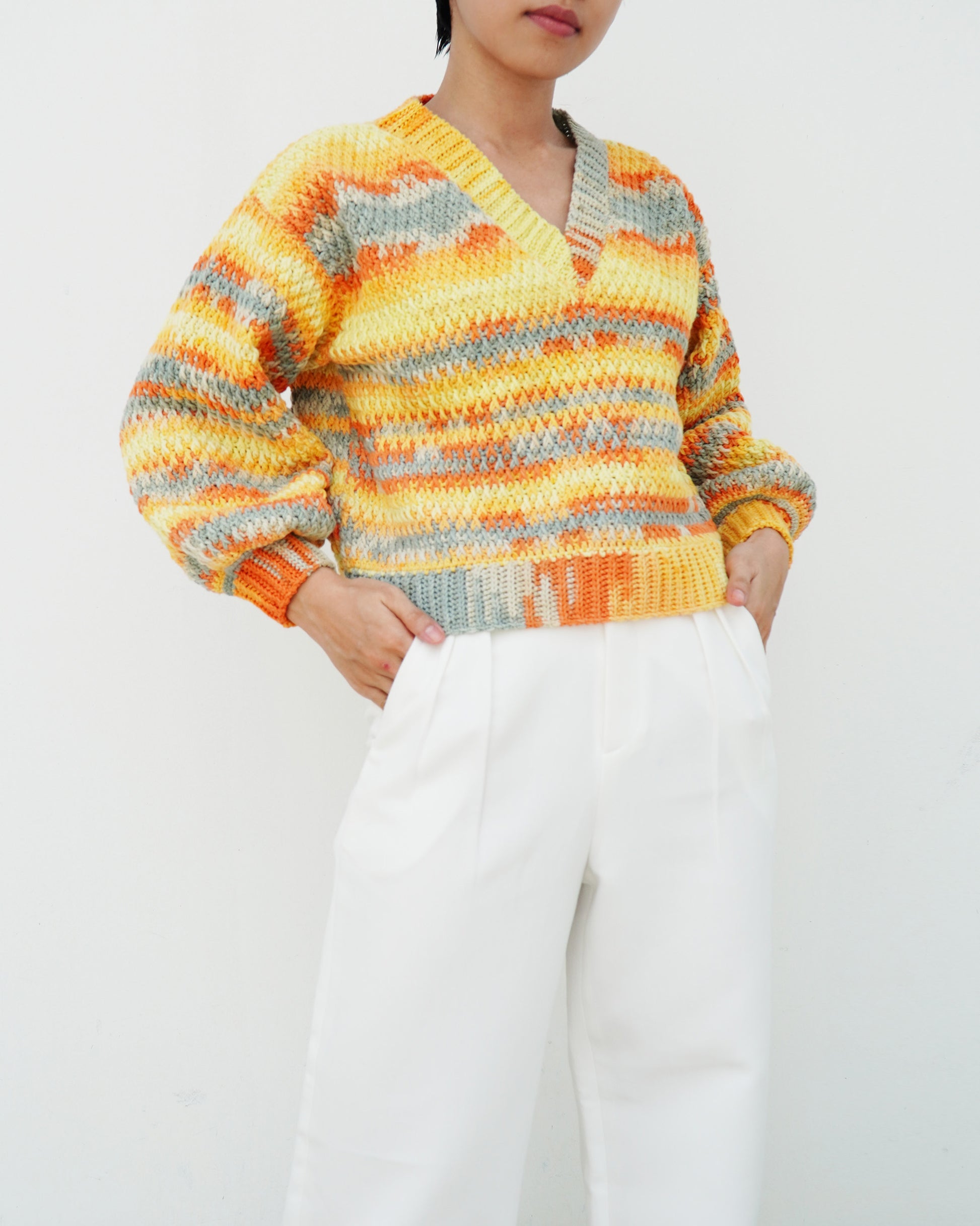 - The sweater is worked in 4 pieces: Back, front panels and two sleeves. Each piece is made bottom-up, separately and then sewn together.